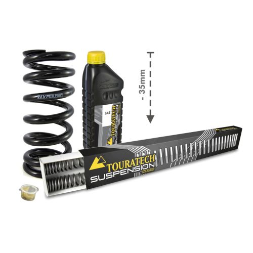 The Touratech Suspension lowering kit from Dutch suspension specialist Hyperpro. The set includes replacement fork springs and a replacement spring for the shock absorber. This spring set allows you to achieve a sensible lowering of 35mm while maintaining excellent handling characteristics – of course, some ground clearance will be lost. The progressive springs are perfectly matched to the KTM 690 Enduro R. After the conversion, the suspension offers significantly improved responsiveness and greater safety at the limit. Replacing the front and rear springs maintains the balance of your motorcycle.