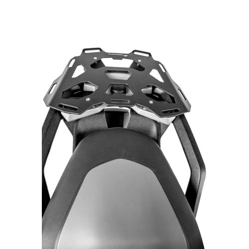 Hassas bir şekilde 4 mm kalınlığında alüminyumdan lazerle işlenen bagaj taşıyıcı, ekipman için kullanılabilir yüzey alanını orijinal BMW bagaj taşıyıcısının neredeyse iki katına çıkarır. Yüzeyleri zarif görünür, şekli motosikletin tasarımına zarif bir şekilde uyum sağlar. Gergi kayışları için çok sayıda girinti ve yuva, çeşitli bağlama seçenekleri sunar. Geniş tasarım aynı zamanda büyük bagajlar için güvenli bir tutuş sağlar. Montajı hızlı ve kolaydır.