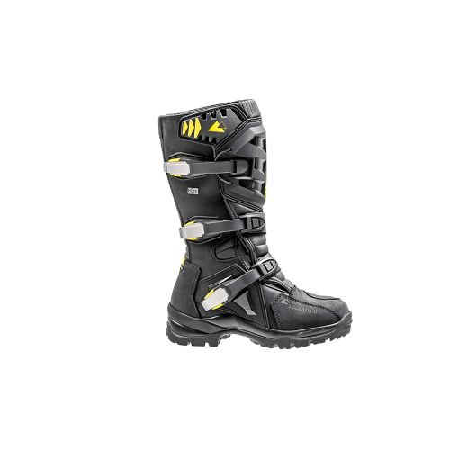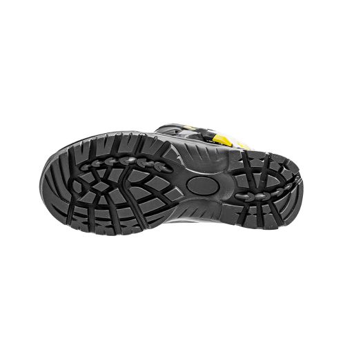 Bu bot, sağlam tabanı, kaval kemiği ve ayak bileği koruyucuları, topuk ve ön ayak üzerinde çift kat deri ve bacağın iç kısmında ısı koruması ile ayrıntılı bir güvenlik konseptine sahiptir. Sağlam vidalı tokaların kullanıldığı üçlü sabitleme, güvenli bir oturuşu garanti eder. En son CE standardına göre sertifikasyon, koruyucuların güvenli koruma etkisini garanti eder.