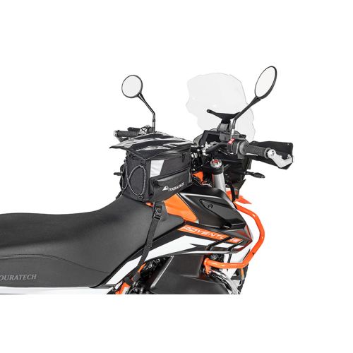 Genişletilebilir bir ana bölme, iki fermuarlı dış cep ve çıkarılabilir bir harita cebi uzun turlarda yeterli hacim sunar. Kapaktaki kablo rondelası ve kredi kartı cebi Touratech standardıdır.