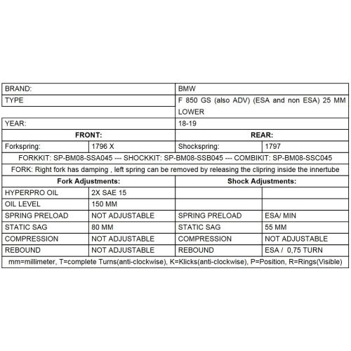 Hollandalı uzman Hyperpro'dan Touratech Suspension'ın alçaltma kiti. Set, ön amortisör yayları ve arka amortisör için bir yay içerir. Bu yay seti, sürüş özelliklerini etkilemeden yükseklikte 25mm'lik bir azalma sağlar - biraz yerden yükseklikte azalma pahasına. Progresif yaylar BMW F850GS / BMW F850GS Adventure'a mükemmel şekilde uyacak şekilde