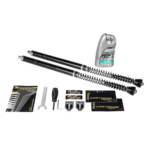 The Cartridge KIT brings the Triumph Thruxton-R into the best possible balance. Spring preload, rebound and compression are fully adjustable from above. The damper oil is in a closed cartridge, so the amount of oil is precisely metered. This means that the closed cartridge offers very finely adjustable damping. This means the most effective, precise suspension setting adapted to your personal driving style at all times, whatever the road conditions or intended use. No matter if motorways, federal highways, smallest country roads or fast, ambitious driving style. Even the most violent road influences on the front wheel are absorbed by the integrated "Hydraulic Endstop".