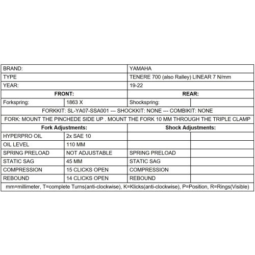 Bu lineer ön amortisör yayları Yamaha 700 Ténéré'nin ön süspansiyonuna mükemmel şekilde uyarlanmıştır. Adventure Set-Up, off-road geçişleri ve enduro sürüşleri ile macera seyahatinin gereksinimlerine göre uyarlanmıştır. Yaylar çok daha doğrudan bir tepkiye ve limitte daha yüksek rezervlere sahiptir.