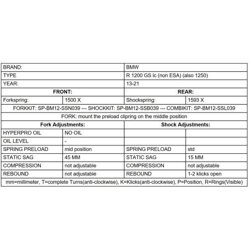 Bu progresif yay seti, BMW R1200GS(LC)/R1250GS'ye mükemmel şekilde uyacak şekilde tasarlanmıştır ve her koşulda süspansiyon tepkisinde “muazzam bir gelişme” ve daha fazla güvenlik sunar. Ön ve arka yayların değiştirilmesi, motosikletinizde önemli bir iyileşme ve daha fazla sürüş keyfi sağlayacaktır.