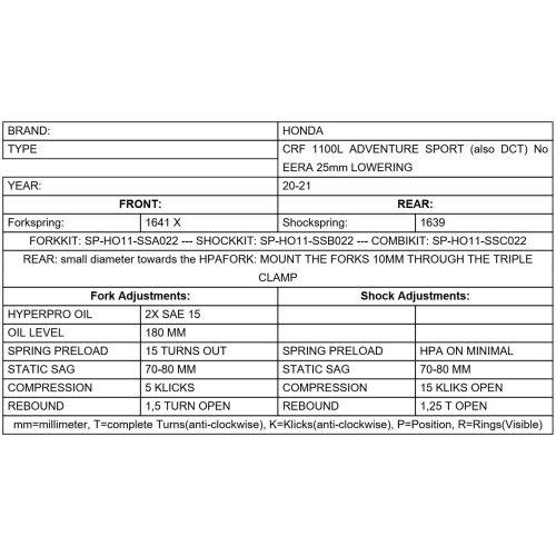 Touratech Suspension tarafından ön süspansiyonu alçaltmak için ön amortisör yayları. Bu yay seti, yerden yükseklikte biraz azalma pahasına sürüş özelliklerini kötüleştirmeden yükseklikte pratik bir -25 mm azalma sağlar. Bu progresif yaylar, Honda CRF1100L Adventure Sports'a mükemmel şekilde uyacak şekilde tasarlanmıştır ve orijinal ön amortisör yaylarına göre aşırı durumlarda tepkide muazzam bir gelişme ve daha fazla güvenlik sunar.
