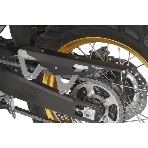 Touratech’s chain guard for the Africa Twin. Much sturdier than the original plastic part, the Touratech chain guard is made from stainless steel and aluminium yet is still relatively light. Visually the metal chain guard fits much better with the overall concept of a touring enduro like the CRF1000L.